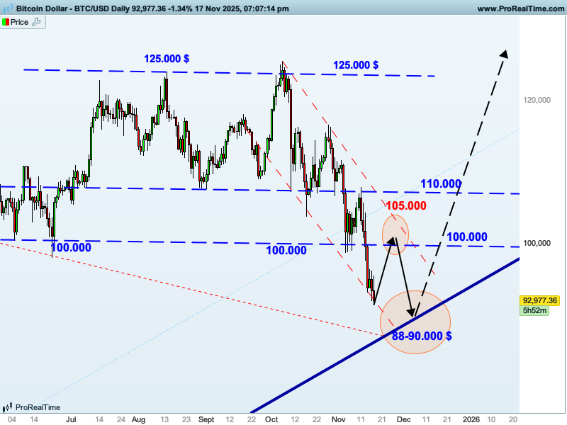 Pero pensamos que quedaría una caída adicional antes de formar un suelo, para formar una vuelta en W con apoyo en el canal alcista de medio-largo plazo, buscando esa zona que hemos dicho anteriormente de 88.000-90.000$.