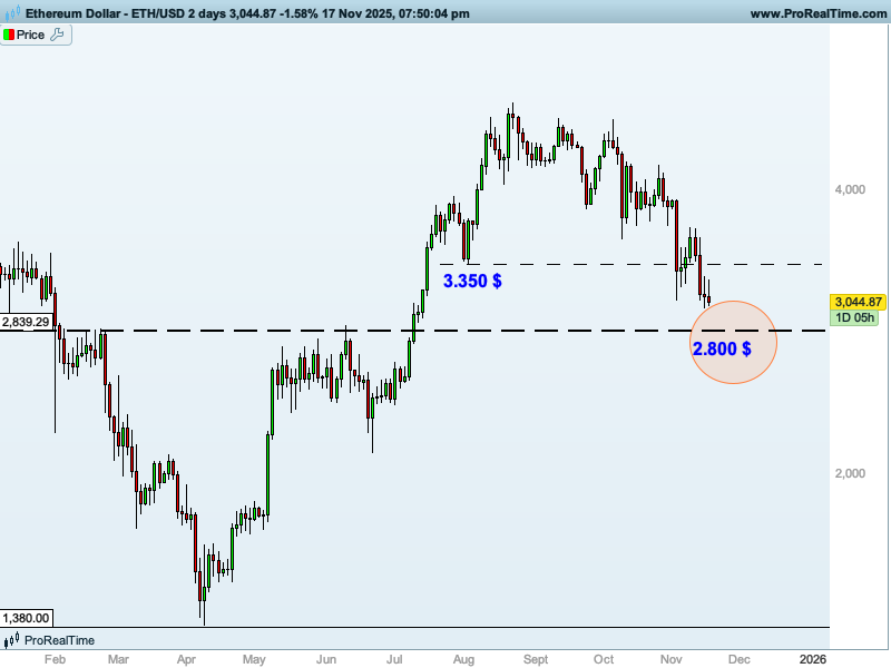 Por último, mostramos el nivel al que podría caer Ethereum y que ya mostramos en el pasado Informe de fecha 4 nov 25: los 2.800$.