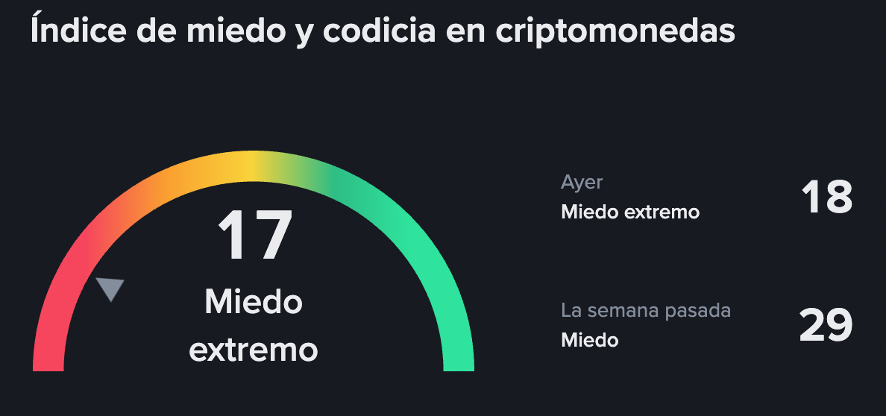 Este miedo queda reflejado en el siguiente Indice de miedo y codicia en criptomonedas, que marca actualmente nivel de 17 y por tanto de «extremo miedo».