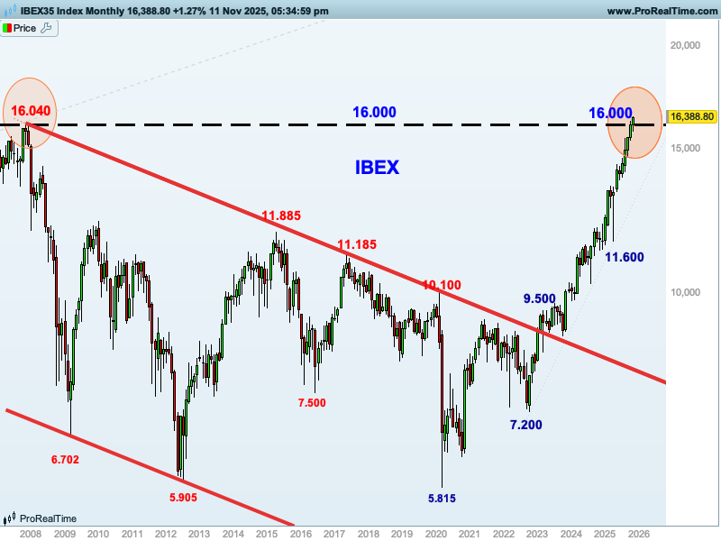 Para ello, podemos ver en el siguiente gráfico cómo los 16.000 puntos fueron los máximos en 2007, y desde entonces el índice no había sido capaz de llegar a este nivel. Y ahora lo está superando con bastante fuerza y claridad, lo cual muestra la fortaleza del índice.