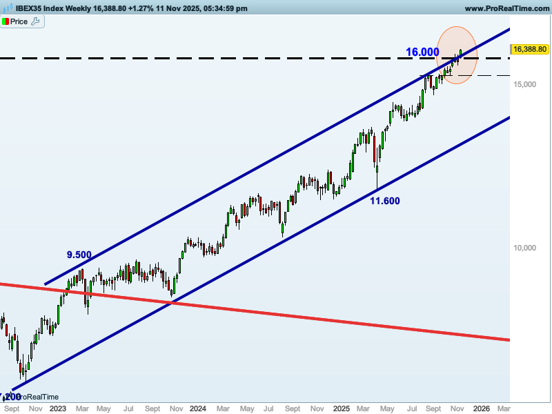 Y si hacemos un poco más de «zoom», vemos cómo el Ibex está consiguiendo no sólo superar los 16.000 puntos sino también superar por la parte de arriba el canal alcista por el que venía subiendo desde 2022.