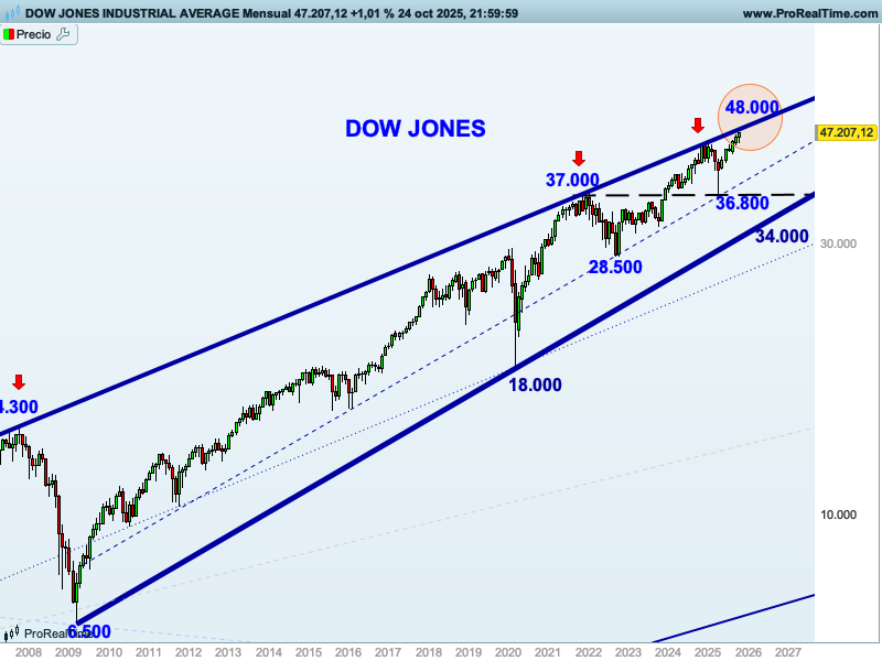 Otro índice director que también está a las puertas de sus zonas de resistencia es el Dow Jones. Por tanto, tal y como podemos ver a continuación, es necesario que el Dow supere con fuerza los 48.000 puntos para validar este escenario de fuertes alzas para las bolsas.