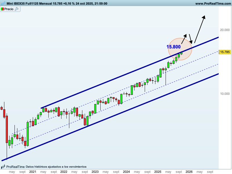 En cuanto al IBEX 35 seguimos igual: estamos en pleno techo de canal, y los 15.800 puntos están ahí. Por tanto, estamos a la espera de que el Ibex consiga superar con claridad los 15.800-16.000 puntos para confirmar el escenario alcista de medio-largo plazo.