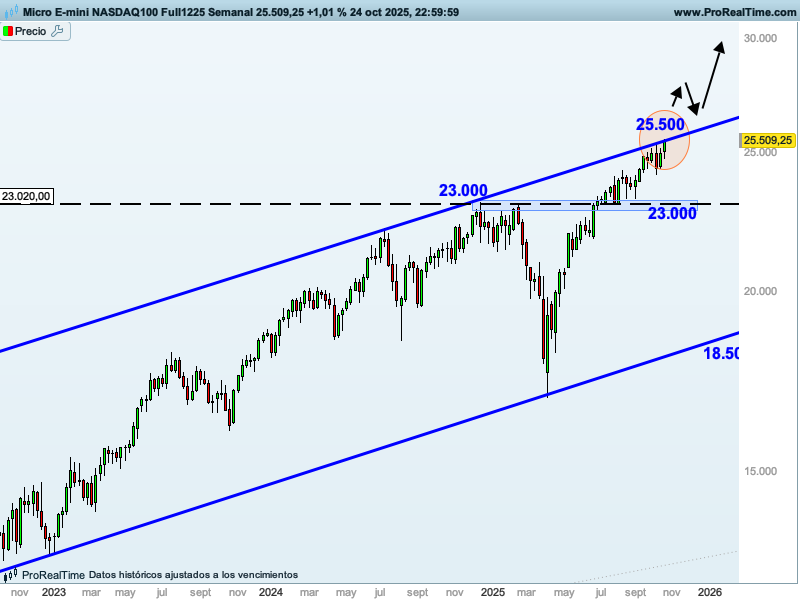 Vayamos ahora al futuro del Nasdaq 100. Este índice está ya a las puertas de la fuerte resistencia de los 25.500 puntos.