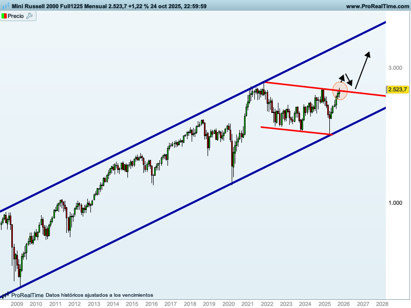 GRÁFICO MENSUAL DEL FUTURO DEL RUSSELL 2000 CON PROYECCIÓN DE POSIBLE ESCENARIO ALCISTA DE LARGO PLAZO