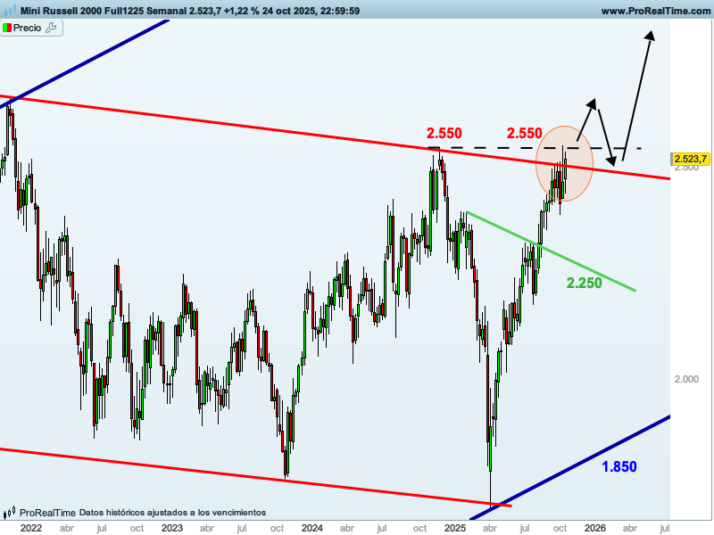 GRÁFICO SEMANAL DEL FUTURO DEL RUSSELL 2000 CON ESTRUCTURAS Y NIVELES CLAVE DE MEDIO PLAZO Y ESCENARIO MÁS PROBABLE