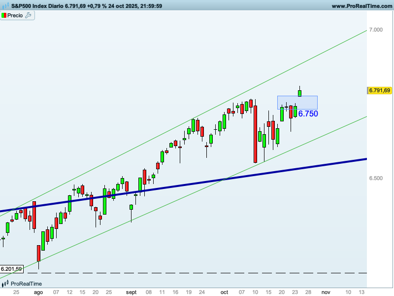 Además, el SP500 ha dejado esta semana un hueco alcista en gráfico diario, lo cual es otra lectura técnica positiva. Y estará activo mientras no lo cierre por debajo de 6.750 puntos.