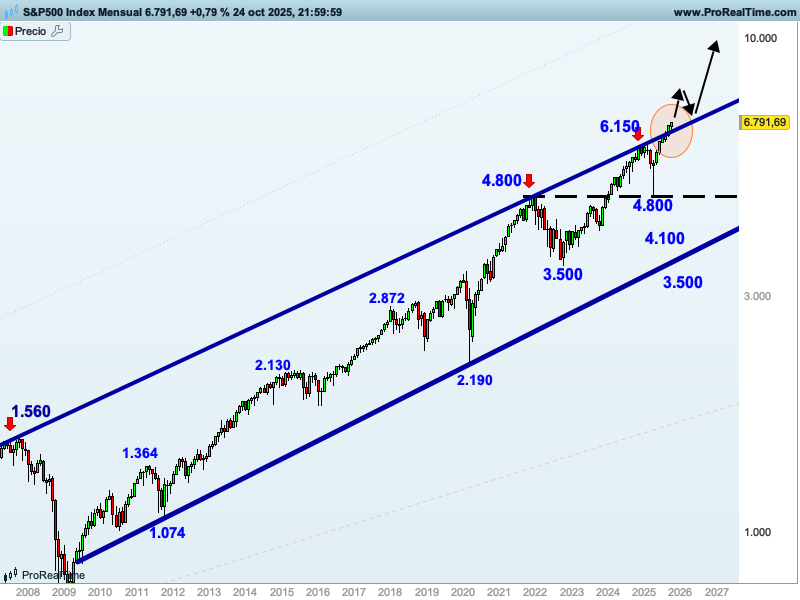 GRÁFICO MENSUAL DEL SP500: ESTRUCTURAS DE LARGO PLAZO Y ESCENARIO MÁS PROBABLE