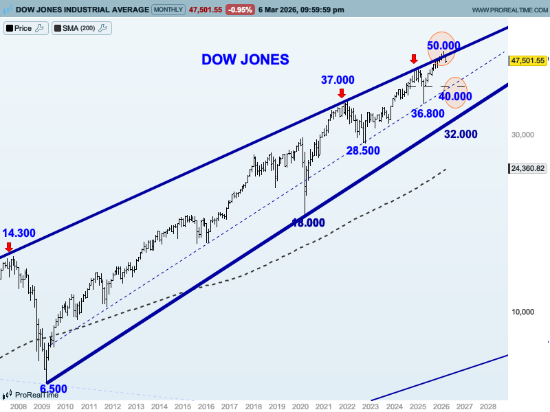 GRÁFICO MENSUAL DEL DOW JONES CON ESTRUCTURAS, NIVELES CLAVE Y PREVISIONES A MEDIO-LARGO PLAZO