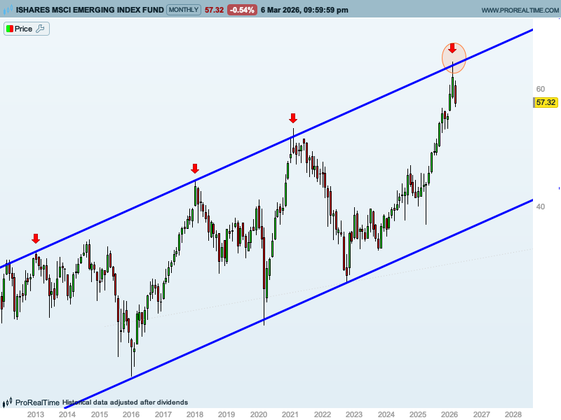 Y esto lo podemos en muchos índices, como el siguiente ETF de bolsas emergentes, el EEM. En el siguiente gráfico vemos que tras una subida muy fuerte desde inicios de 2025, ahora el índice ha llegado a la zona de techos del canal alcista, por el que viene subiendo desde 2012.
