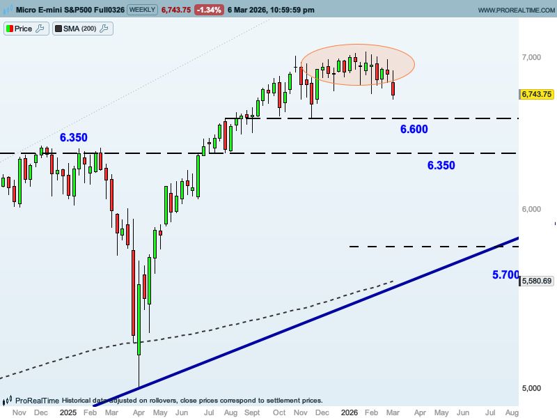 GRÁFICO SEMANAL DEL FUTURO DEL SP500 CON ESTRUCTURAS, NIVELES CLAVE Y FIGURA DE TECHO REDONDEADO