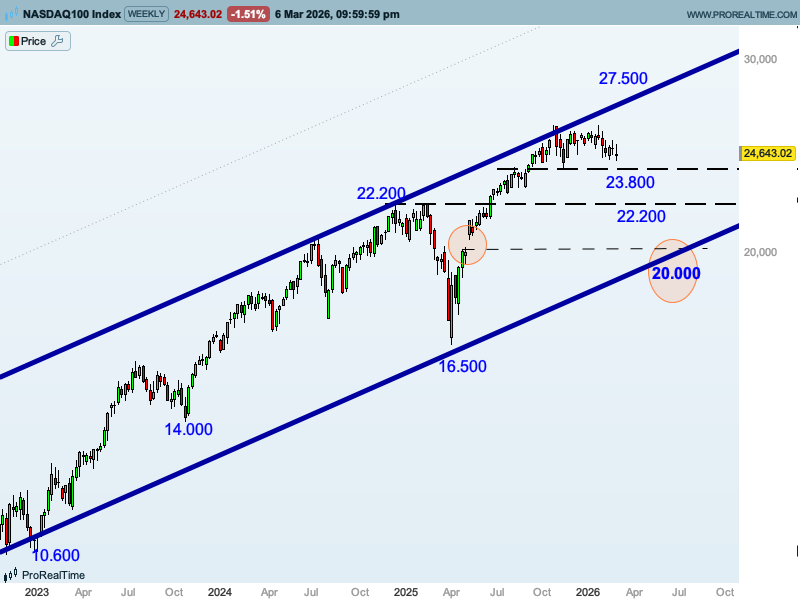 Si bien los 23.800 puntos y los 22.200 puntos van a ser soportes importantes difíciles de perforar y desde donde el Nasdaq podrá generar rebotes fuertes, pensamos que el índice podría acabar bajando hasta los 20.000 puntos durante los próximos meses, pues además de ser el retroceso fibo del 61,8%, ahí estaría la base del canal alcista de largo plazo, por ahí pasaría la media semanal de 200 sesiones y además cerraría el hueco que hemos señalado, zona que las manos fuertes suelen tener muy presentes ya que el mercado suele acabar «rellenando» este tipo de huecos.