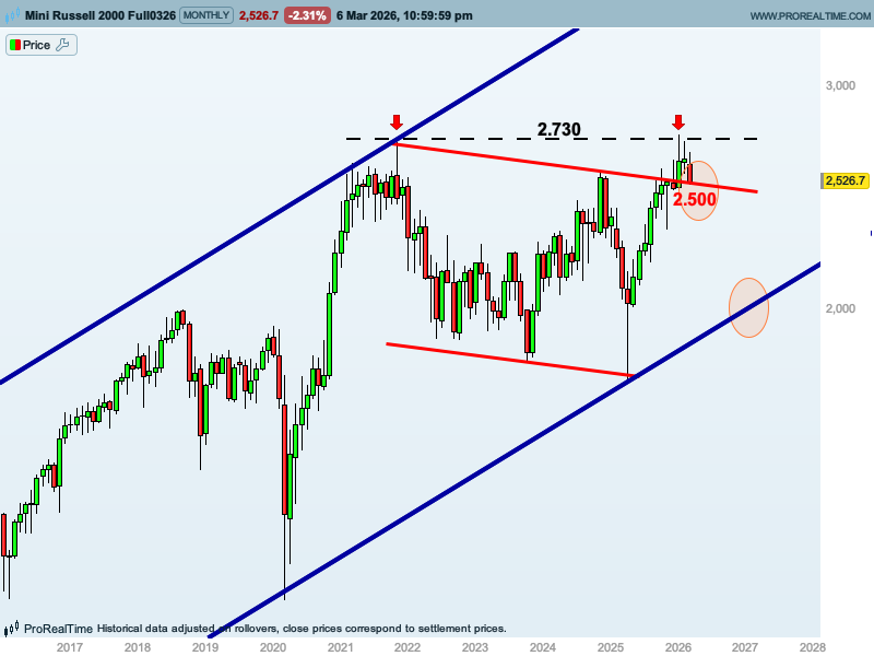 Si esto fuera así y el Russell no aguanta el nivel de 2.500 puntos, la ruptura del canal habría sido «falsa» y el índice caería a buscar apoyo en la base de su canal alcista de largo plazo, donde volvería a ofrecer una clara señal de compra.