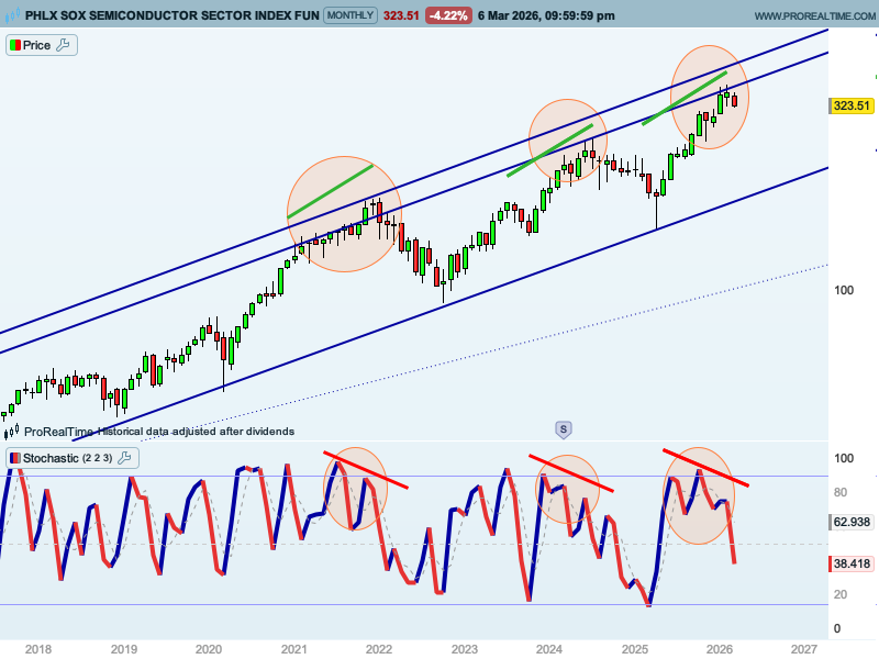 Vayamos al gráfico, en el que vemos la evolución del Soxx desde 2018. En los 2 casos que ha sufrido caídas importantes, 2022 y 2024, se habían formado previamente las mismas divergencias bajistas que tenemos a día de hoy. Faltaría que esta foto fuera al cierre de marzo, ya que se trata de velas mensuales, pero también tenemos divergencias en gráficos de 3 semanas que nos invitan a pensar que marzo podría acabar confirmando esta divergencia mensual.