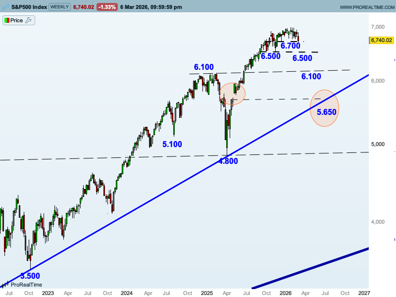 –5.650 puntos, retroceso del 61,8%. Este nivel es el gran soporte, porque además por ahí pasa la directriz alcista de largo plazo, la media semanal de 200 periodos, y ahí dejó un hueco semanal que tendría mucho sentido que en esta caída baje a rellenarlo.