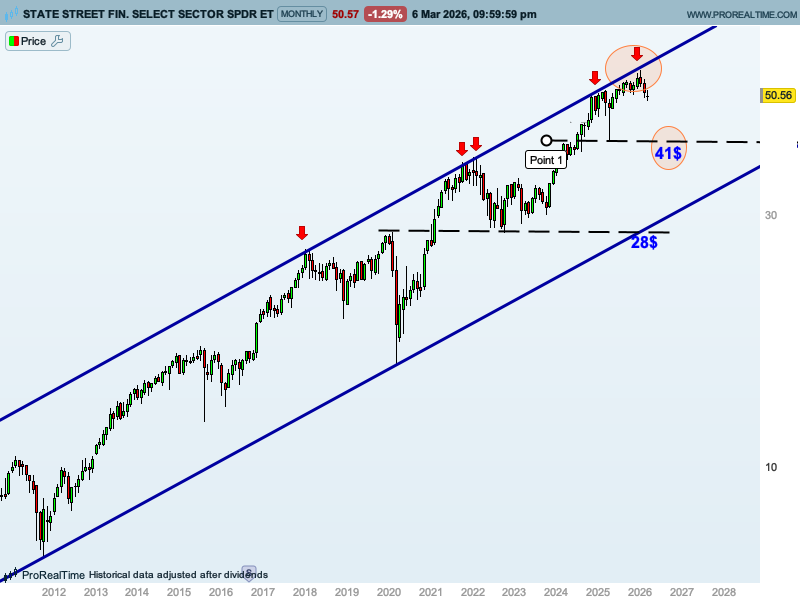Tal y como podemos ver en el siguiente gráfico mensual del XLF, el índice ha llegado al techo del canal alcista por el que viene subiendo desde 2012, y de ahí no ha podido pasar.