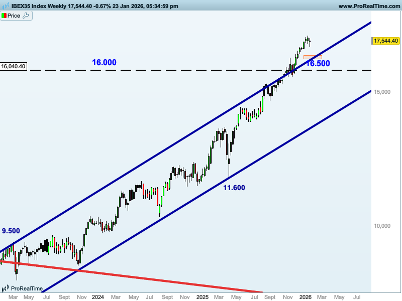 En el caso del Ibex 35, si el índice decide buscar apoyos más abajo, tendría muy cerca la zona de los 17.200, y si los pierde, más abajo podría encontrar apoyo en esa directriz alcista que superó, zona de los 16.500 puntos, pues ahora podría pasar a funcionar como soporte.