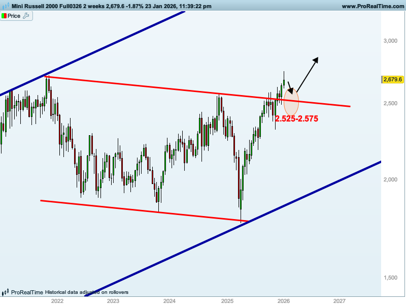 Para empezar, queremos recordar cuál es nuestra hoja de ruta «general» para las bolsas, que quedó muy bien representada en el siguiente gráfico del futuro del Russell 2000 en el Informe del pasado 9 de enero y que compartimos de nuevo.