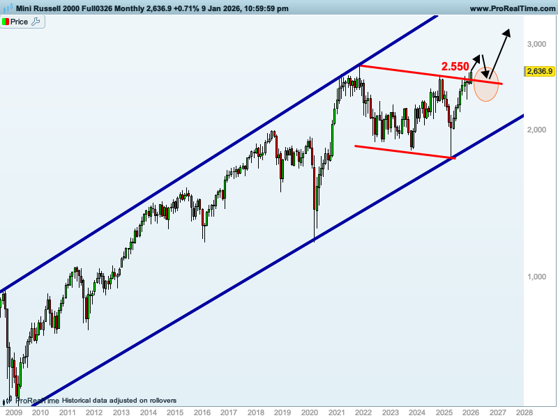 GRÁFICO MENSUAL DEL PASADO 9 ENERO 2026 DEL FUTURO DEL RUSSELL 2000 CON ESTRUCTURAS, NIVELES CLAVE Y PROYECCIONES