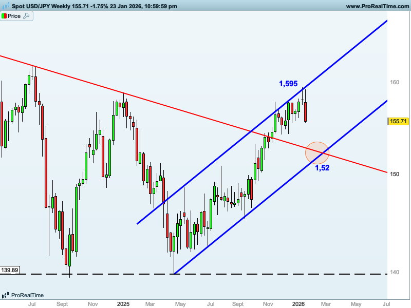GRÁFICO SEMANAL DEL PAR USD/JPY CON ESTRUCTURAS Y NIVELES CLAVE DE CORTO Y MEDIO PLAZO