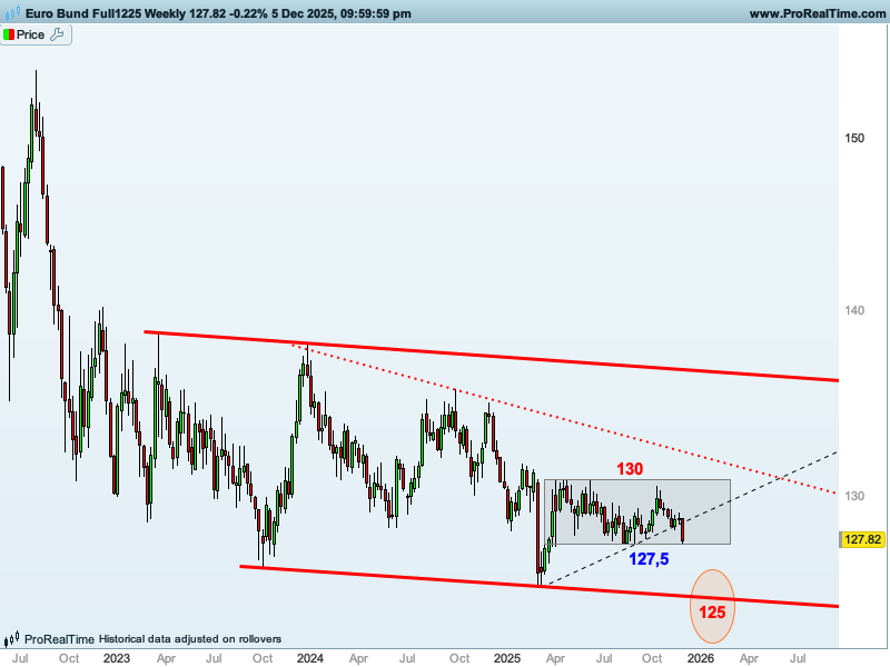 Y por su parte, el Bund alemán (bono a 10 años) evoluciona por estructuras laterales de medio plazo, y actualmente no debe perder los 127,5 puntos, zona que lo viene aguantando durante las últimas semanas.
