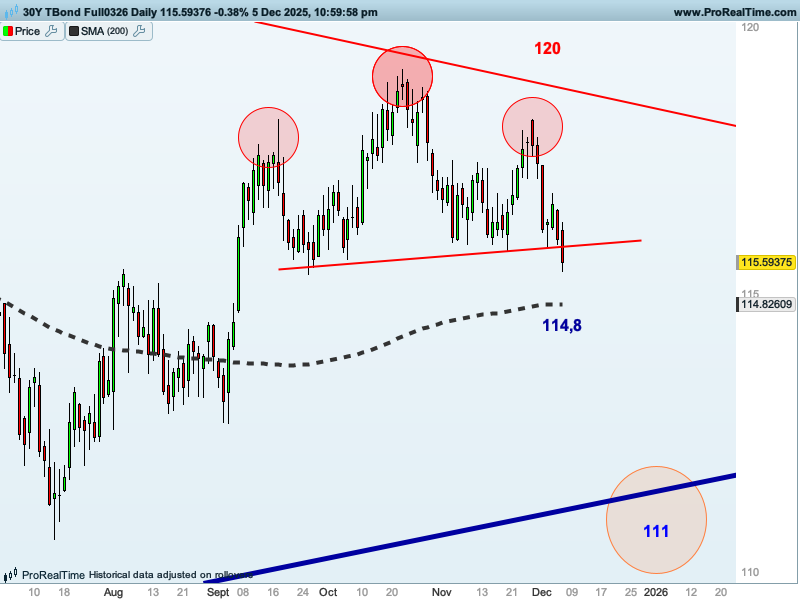 En cuanto al T-Bond, bono de EEUU a 30 años, vemos que no pudo superar la zona de los 120, y desde ahí ha retomado la senda bajista.