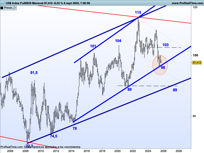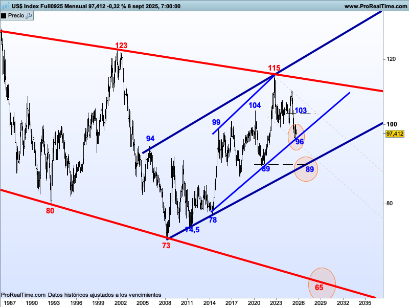GRÁFICO MENSUAL DEL DÓLAR INDEX CON NIVELES DE LARGO PLAZO A VIGILAR