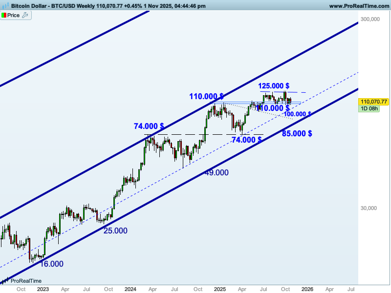 Y una vez que supere los 125.000$, el Bitcoin podría escalar con dirección a la zona de techos del canal alcista, lo que lo proyectaría a niveles de 180.000$ en el medio-largo plazo.