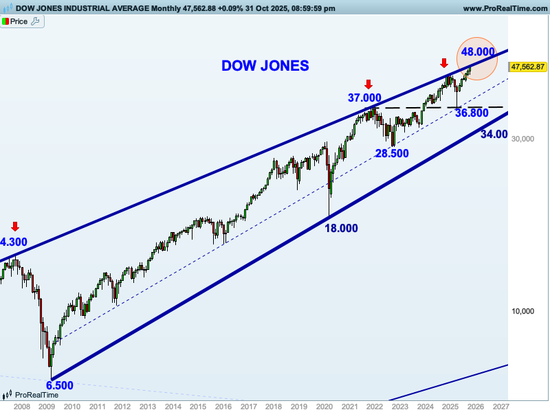 GRÁFICO MENSUAL DEL DOW JONES CON ESTRUCTURAS Y NIVELES CLAVE DE LARGO PLAZO