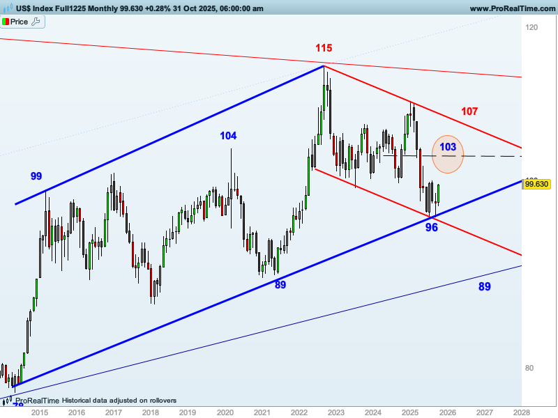GRÁFICO MENSUAL DEL DÓLAR INDEX CON ESTRUCTURAS Y NIVELES CLAVE DE MEDIO Y LARGO PLAZO