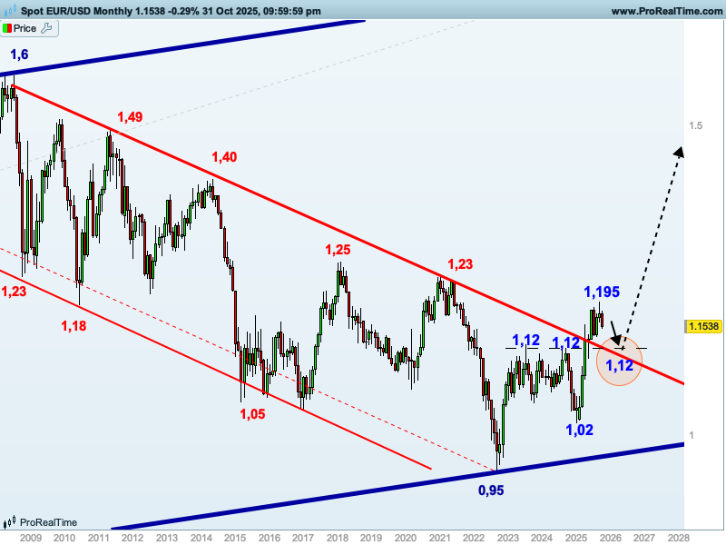 GRÁFICO MENSUAL DEL EUR.USD SPOT CON ESTRUCTURAS Y NIVELES CLAVE, ASÍ COMO PROYECCIONES