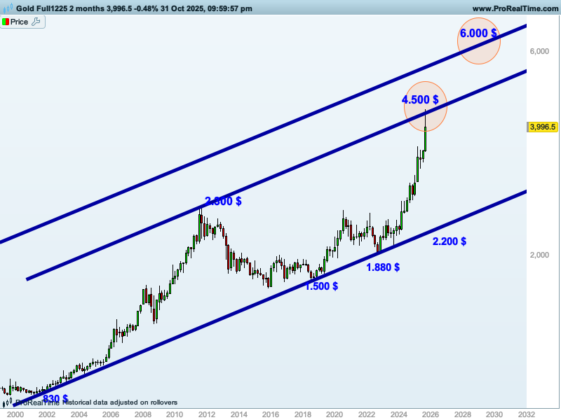 Nuestra visión del oro para el largo plazo lo sitúa en niveles de 6.000 $. Es decir, en el largo plazo esperamos que el oro suba a ese nivel de 6.000 $, ya que hay una fuerte demanda tanto de bancos centrales como de inversores en general, estos últimos buscando una mayor diversificación en sus carteras, dado que la deuda pública está perdiendo parte de su atractivo por los altos y crecientes niveles tanto de déficit como de deuda pública.