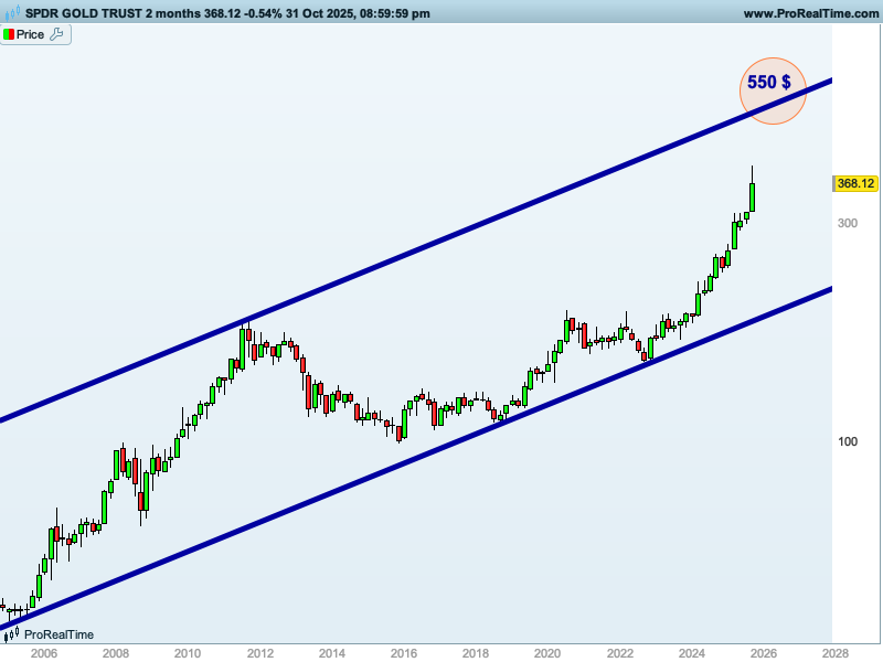 GRÁFICO BIMENSUAL DEL GLD (ETF DEL ORO) CON ESTRUCTURAS Y NIVELES CLAVE A LARGO PLAZO