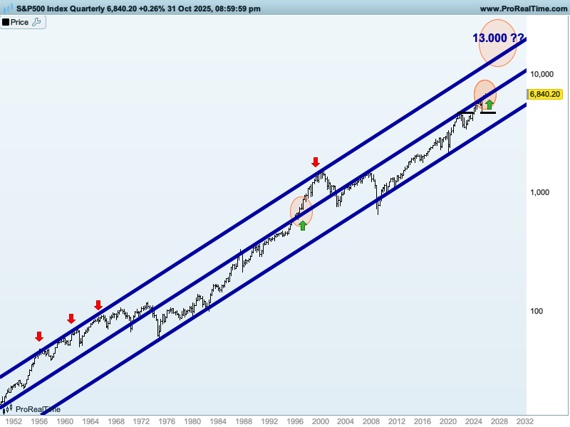 Veamos esta proyección con más detenimiento. Y para ello, vamos a utilizar el siguiente gráfico trimestral del SP500 desde 1950. La idea que queremos trasladar es simple.