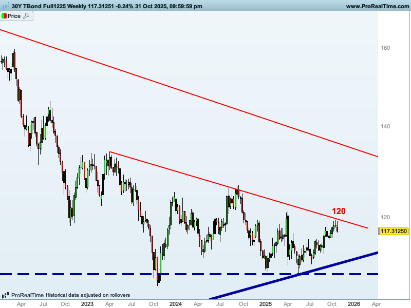 Tal y como podemos ver en el siguiente gráfico, mientras que el precio del bono a 30 años de EEUU (T-Bond) no supere el nivel de 120, no habrá una subida sostenida en el precio de los bonos (o lo que es lo mismo, una bajada en su rentabilidad).