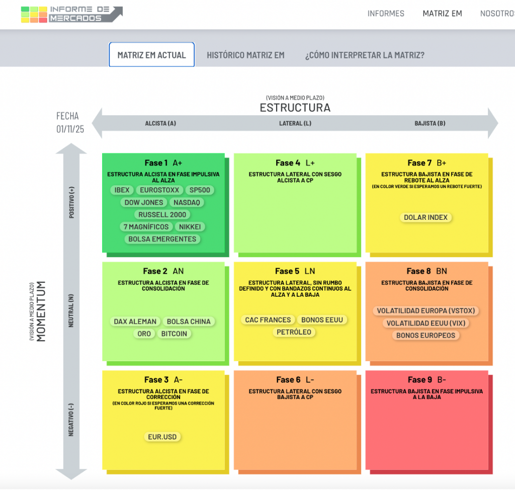 La Matriz Estructura-Momentum (Matriz EM), de creación propia, es una herramienta que permite entender en qué situación se encuentra cada mercado y qué podemos esperar de cada uno como escenario más probable, con una visión de medio plazo (a semanas vista).