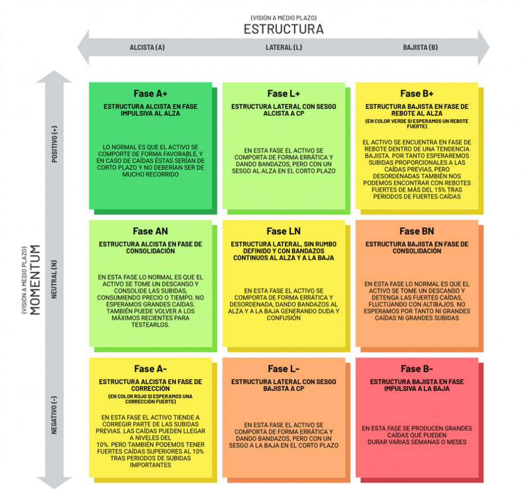 MATRIZ ESTRUCTURA-MOMENTUM CON EXPLICACIÓN DEL COMPORTAMIENTO MÁS HABITUAL EN CADA FASE DE MERCADO