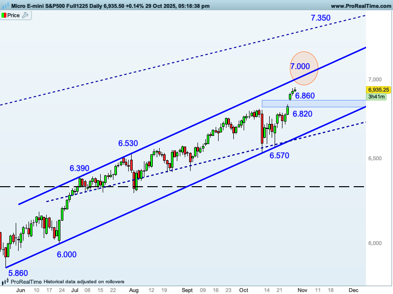 Tal y como podemos ver en este gráfico diario, el canal de corto plazo proyecta al futuro del SP500 a la zona de 7.000 puntos. Ese nivel es clave, y por abajo el nivel clave es el hueco alcista dejado recientemente entre los niveles 6.860-6.820.