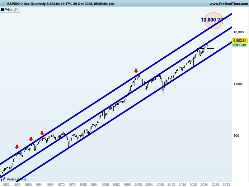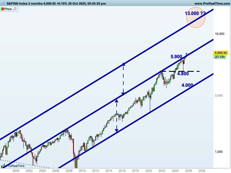 Si nos fijamos, la nueva directriz alcista proyectada no sólo conecta con los máximos del año 2000, sino también con 3 máximos previos importantes conseguidos entre 1955 y 1965. Por tanto, nosotros damos por válida esta nueva directriz de muy largo plazo y de ella nos vamos a «aprovechar» para extraer toda la información que aporta, que es mucha.