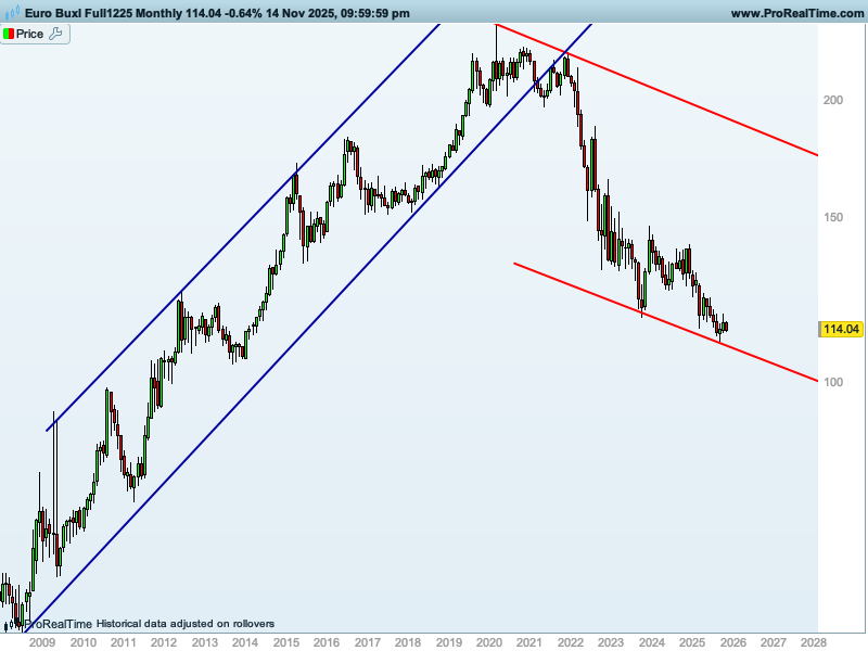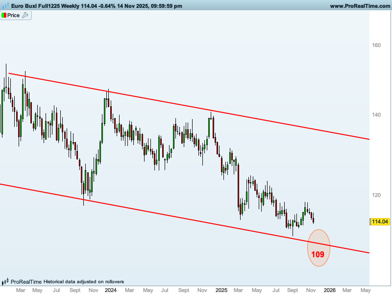 Más a corto plazo, podemos ver la evolución del bono alemán a 30 año, el BUXL, el cual sigue bajando por una canal bajista de medio plazo. En el siguiente gráfico podemos ver que podría seguir bajando hasta el nivel de 109, lo cual representa una caída no despreciable, pero más caída no le vemos por el momento.