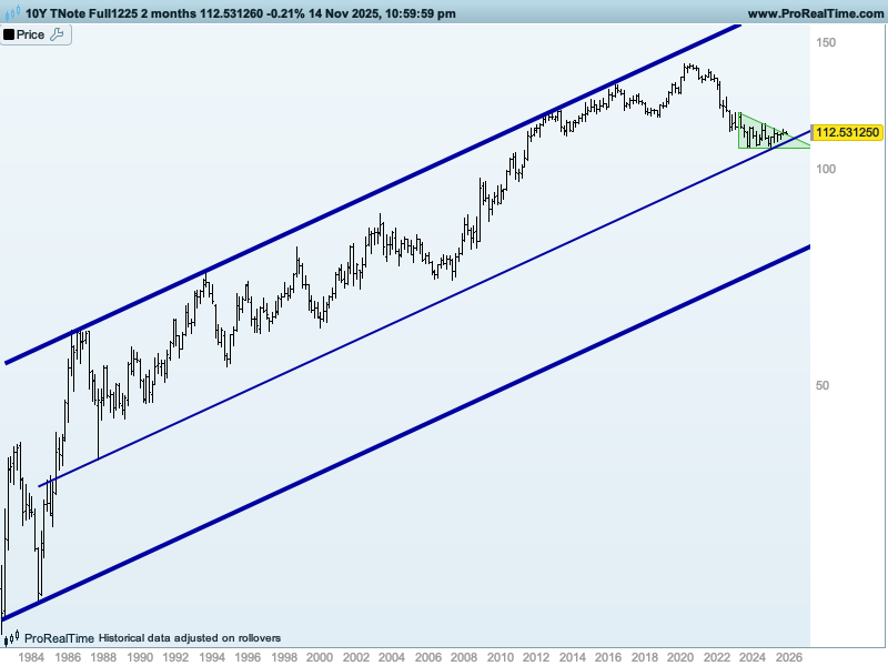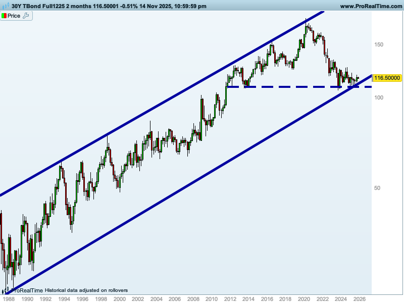 El gráfico del T-Bond (bono EEUU a 30 años) recoge muy bien estas dos fases y muestra un gran canal alcista de largo plazo que culmina en un máximo histórico en 2020, seguido por una caída muy pronunciada que lleva el precio a la base del canal.