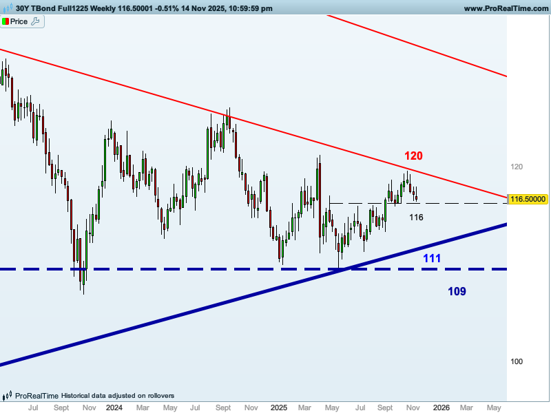 En cuanto al T-Bond, bono de EEUU a 30 años, vemos que la zona clave ahora son los 116 puntos. Si los pierde, podría caer hasta los 111 puntos con extensión hasta los 109, donde hemos visto que tiene soportes muy fuertes de largo plazo.