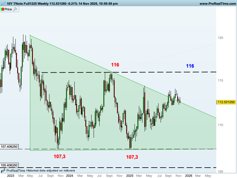 Por último, veamos la referencia de los bonos a 10 años en EEUU. Mientras el T-Note no supere la zona de los 116 puntos, no veremos subidas sostenidas. Y por abajo tendría un soporte muy fuerte en los 107,3 puntos, nivel que no esperamos que pierda en caso de caídas.