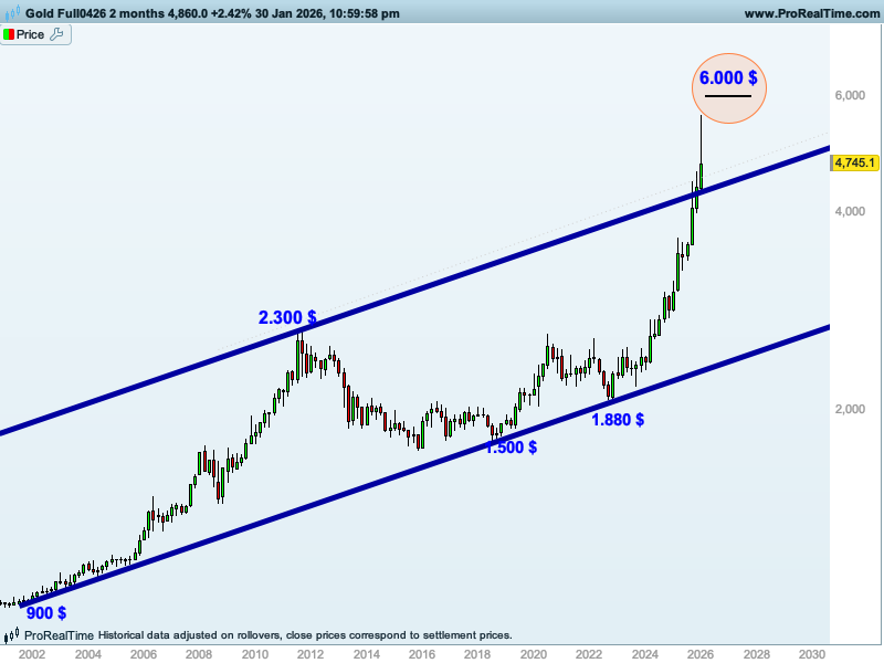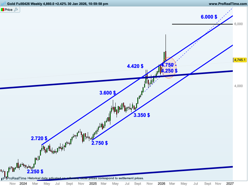 Y respecto al oro, pensamos que antes o después el oro acabará llegando al nivel de los 6.000$, pero para ello es necesario que rompa el máximo reciente de los 5.600$. Mientras, podría consolidar entre este nivel de los 5.600$ y la zona de los 4.750 $ -4.250 $, ya que son soportes relevantes, y la pérdida de este último nivel lo podría llevar hacia los 4.000 $.