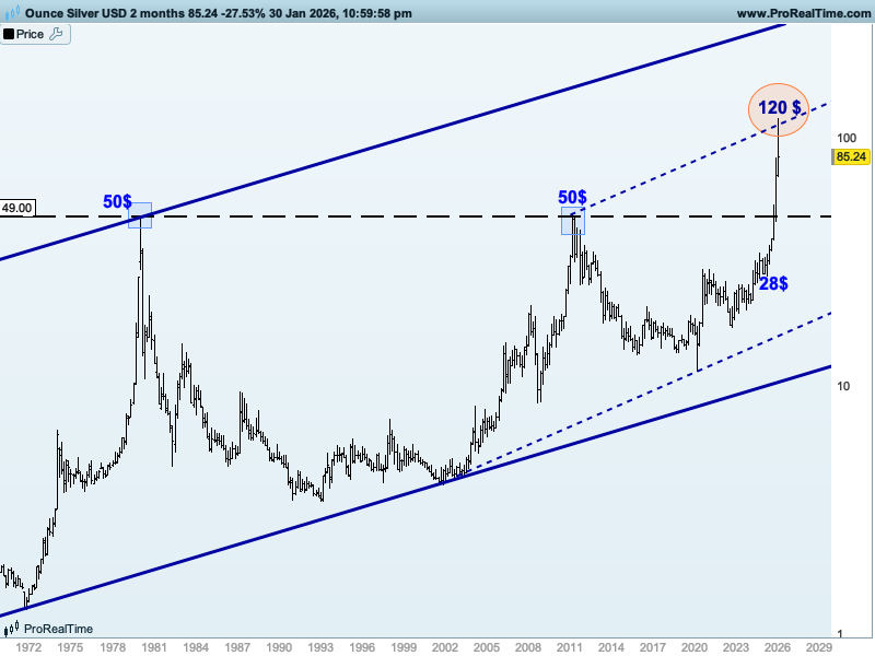 GRÁFICO BIMENSUAL DE LA PLATA CON ESTRUCTURAS Y NIVELES CLAVE DE MEDIO Y LARGO PLAZO