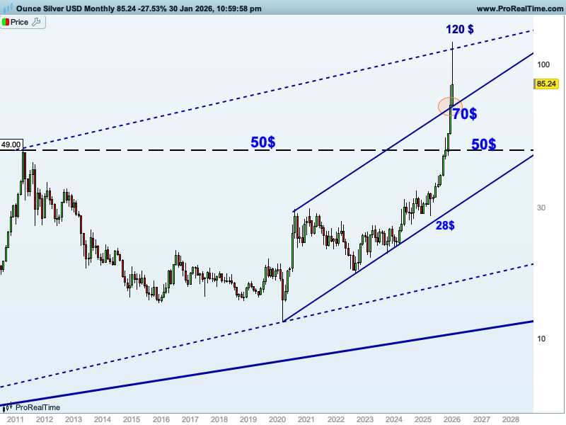 Y por abajo, dos niveles claros. Mientras no pierda los 70$, entenderemos que está en una fase 2 de consolidación sin dañar ninguna estructura relevante. Durante esta fase de consolidación, la plata podría zigzaguear hasta dicho nivel de 70$, así como subir y testear de nuevo la zona de máximos en 120$, pero sin superarla con claridad.