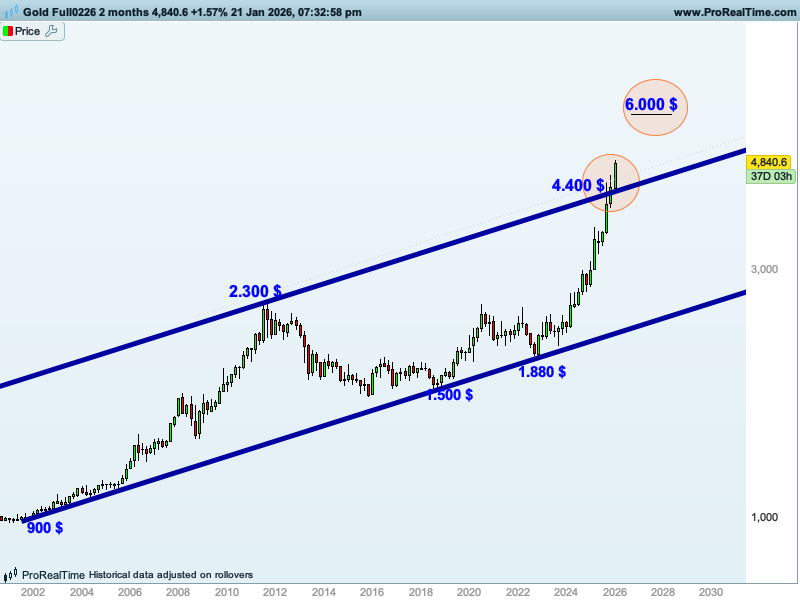 Por tanto, trasladando ese recorrido al oro, nuestra previsión a largo plazo para el oro es que llegue (por lo menos) hasta los 6.000$.