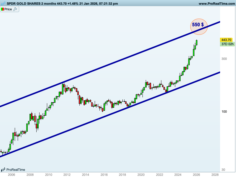 Y por otra parte, si lleguamos a dicho nivel de los 550$ del GLD, ahí tendría mucho sentido o probabilidad esperar algún tipo de tropiezo, parada o correccón, ya que estaríamos en la parte alta de un canal alcista de muy largo plazo.