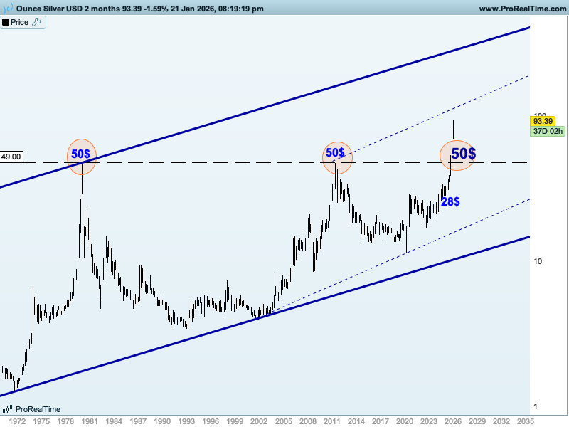 Y ese nivel de resistencia son los 50$, tal y como podemos ver en el siguiente gráfico bimensual de la plata, que recoge su evolución desde 1972.