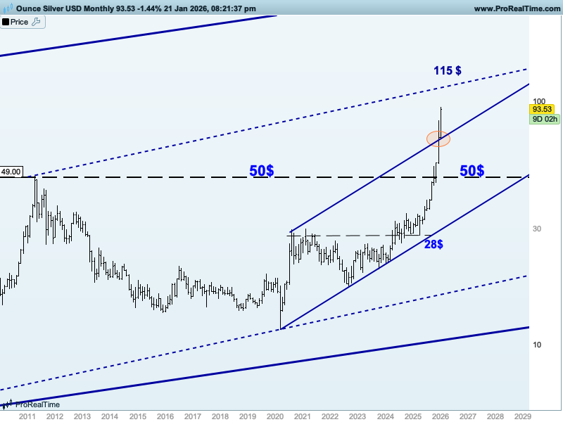 Pensamos que el oro puede llegar a los 6.000$ a largo plazo. Y respecto a la plata, los próximos niveles psicológicos a vigilar son los 100 $ y los 115 $, donde podría producirse alguna pausa o corrección técnica.